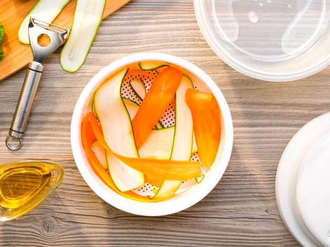 Con uno sbucciatore, ottenere fette lunghe e sottili da 1 zucchina e 1 carota, distribuirle sul fondo traforato del cestello per cottura a vapore della vaporiera per microonde e cuocere per 5 minuti nel recipiente di cottura con un po’ d’acqua e con il coperchio applicato, nel forno a microonde a 400 W. Servire con un filo d’olio ed erbe aromatiche.