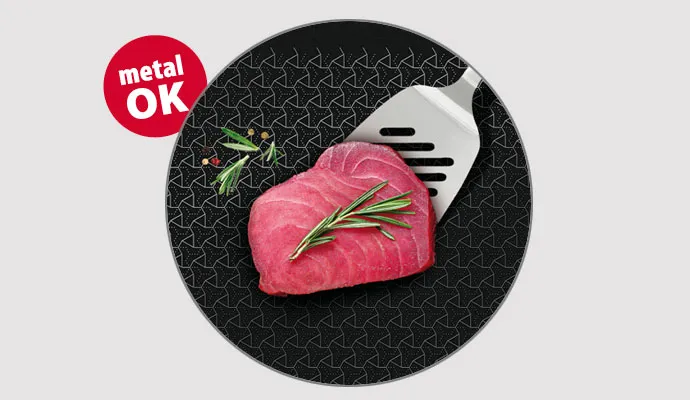 Il rivestimento antiaderente, con reticolo in acciaio inox, resiste all’uso con utensili da cucina in metallo.
