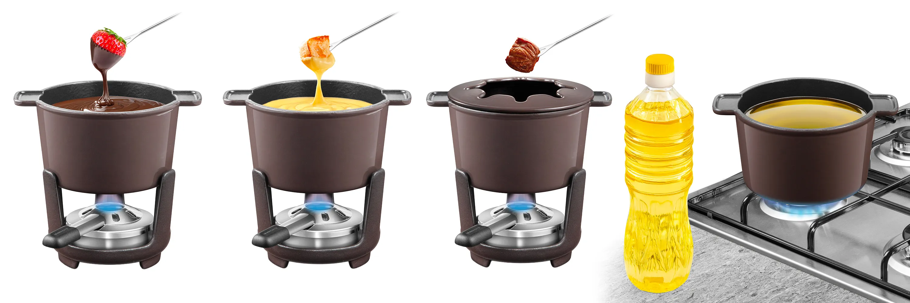 si compone di un supporto, di una pentola adatta a tutti i tipi di piano cottura, anche al piano a induzione, di un coperchio con incavi per le 6 forchettine incluse, con terminali in colori diversi per aiutare ogni commensale ad individuare la propria.